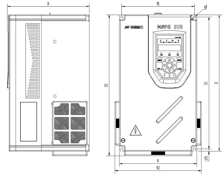 變頻器型號(hào) | W (mm) | W1 (mm) | W2 (mm) | H (mm) | H1 (mm) | H2 (mm) | H3 (mm) | D (mm) | d (mm) |