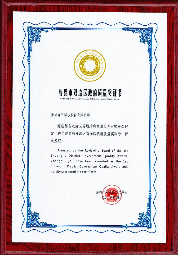 成都市雙流區(qū)政府質(zhì)量獎證書