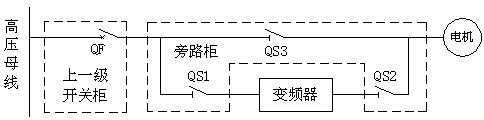 3、QS1、QS2閉合時(shí),QS3斷開時(shí),QF閉合時(shí),電機(jī)由變頻器控制調(diào)速運(yùn)行。QS1斷開、QS2斷開、QS3閉合時(shí),電機(jī)可由QF直接啟停并進(jìn)行保護(hù),變頻器可完全和電網(wǎng)脫離,便于維護(hù)與檢修。