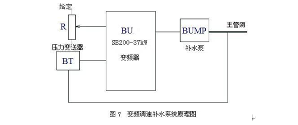 為更進一步的節(jié)能,對換熱站實施了自動化改造,循環(huán)泵和補水泵用變頻調節(jié),整個城市供熱系統(tǒng)用計算機進行監(jiān)控,實現(xiàn)了換熱站無人值守。通過循環(huán)泵使熱水在供熱系統(tǒng)中運行,管道、閥門的泄漏引起循環(huán)水的水壓降低,如不及時補水,會造成供熱系統(tǒng)運行不正常。補水泵的變頻泵補水方式比較簡單,采用恒壓供水方式,設定壓力為4kg。本例選用一臺森蘭SB200系列3.7KW變頻器,選用森納斯DG130W-BZ-A 1MPa壓力變送器,變頻調速補水系統(tǒng)如圖7所示: