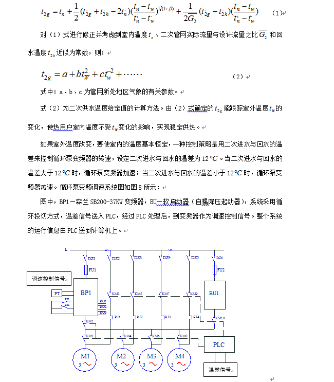 為節(jié)省能源,減少城市污染,充分利用火力發(fā)電廠蒸汽輪機發(fā)電后的余熱,在冬季對北方城市集中供熱。從發(fā)電廠送出來的熱水,到城市中的換熱站時,一次供水熱水溫度有90多度,經(jīng)過熱交換器后,一次回水熱水的溫度下降到60多度,然后再流回發(fā)電廠。送到城市居民家中的熱水,進入換熱站熱交換器的二次回水溫度有50多度,二次供水溫度60多度。陜西寶雞有許多這樣的換熱站,其中有一換熱站有四臺熱交換器,四臺37kW的管道泵組成的循環(huán)泵組,一臺3.7kW的補水泵。循環(huán)泵和補水泵采用人工開、關閥門控制流量,使管路的阻尼增大而造成電能浪費。
