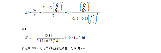 循環(huán)泵變頻調速后,所有的閥門開度最大,系統(tǒng)的阻力最小,當平均流量是設計流量的80%時,節(jié)電率可按GB12497《三相異步電動機經(jīng)濟運行》強制性國家標準實施監(jiān)督指南中的計算公式計算: