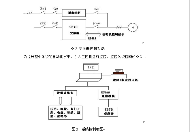 模擬量數(shù)據(jù)采集卡將壓力、流量、閥門開度、電機(jī)溫度和管道溫度等模擬信號轉(zhuǎn)換成12位的數(shù)字信號,每一路信號占用數(shù)據(jù)采集卡上一個模擬通道,互不影響,采樣周期為300ms。SB70變頻器支持RS485半雙工串行通訊方式,通過在工控機(jī)上用IP函數(shù)或VB的MSCDMM通訊控件編制串行通訊程序,即可實(shí)現(xiàn)工控機(jī)與變頻器之間的通訊,本系統(tǒng)用VB的通訊控件編制。將采集到的數(shù)據(jù)信號,經(jīng)實(shí)時分析處理后,通過組態(tài)王監(jiān)控畫面,監(jiān)測現(xiàn)場傳輸?shù)膶?shí)時數(shù)據(jù)和歷史數(shù)據(jù)及設(shè)備的運(yùn)行狀況、歷史曲線的分析、實(shí)時報表、歷史報表的打印、聲光報警等。