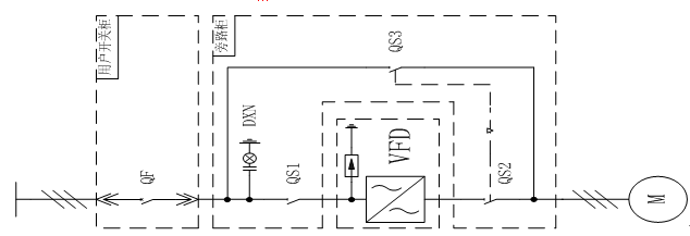 合QS3、分QS1、QS2為工頻模式。電機可由QF直接啟停并進行保護,變頻器可完全和電網(wǎng)脫離,便于維護與檢修。