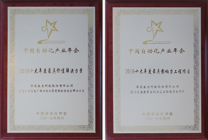 中國自動(dòng)化領(lǐng)域年度獎(jiǎng)項(xiàng)評(píng)選現(xiàn)場(chǎng),希望森蘭科技股份有限公司榮獲“2016中國自動(dòng)化領(lǐng)域十大年度企業(yè)”,公司“大型火力發(fā)電廠鍋爐給水泵變頻改造綜合解決方案”被評(píng)為“2016十大年度最具價(jià)值解決方案”,此外,“廈門遠(yuǎn)海集裝箱碼頭高壓船舶岸電項(xiàng)目”獲得“2016十大年度最具影響力工程項(xiàng)目”三項(xiàng)重要大獎(jiǎng)。