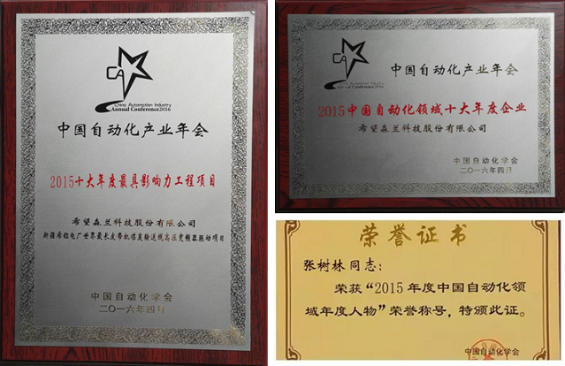 在2015中國(guó)自動(dòng)化領(lǐng)域年度獎(jiǎng)項(xiàng)評(píng)選現(xiàn)場(chǎng),希望森蘭科技股份有限公司獲得“2015中國(guó)自動(dòng)化領(lǐng)域十大年度企業(yè)”,公司副總經(jīng)理張樹林先生榮獲“2015中國(guó)自動(dòng)化領(lǐng)域年度人物”,此外,希望森蘭的“新疆希鋁電廠世界最長(zhǎng)皮帶機(jī)煤炭輸送線高壓變頻器驅(qū)動(dòng)項(xiàng)目”獲得“2015中國(guó)自動(dòng)化領(lǐng)域十大年度最具影響力工程項(xiàng)目” 三項(xiàng)重要大獎(jiǎng)。
