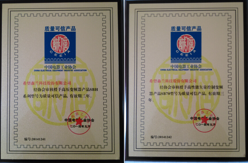 森蘭SBH系列高壓變頻器、SB70高性能矢量控制變頻器榮獲中國(guó)電器工業(yè)協(xié)會(huì)“質(zhì)量可信產(chǎn)品”獎(jiǎng)